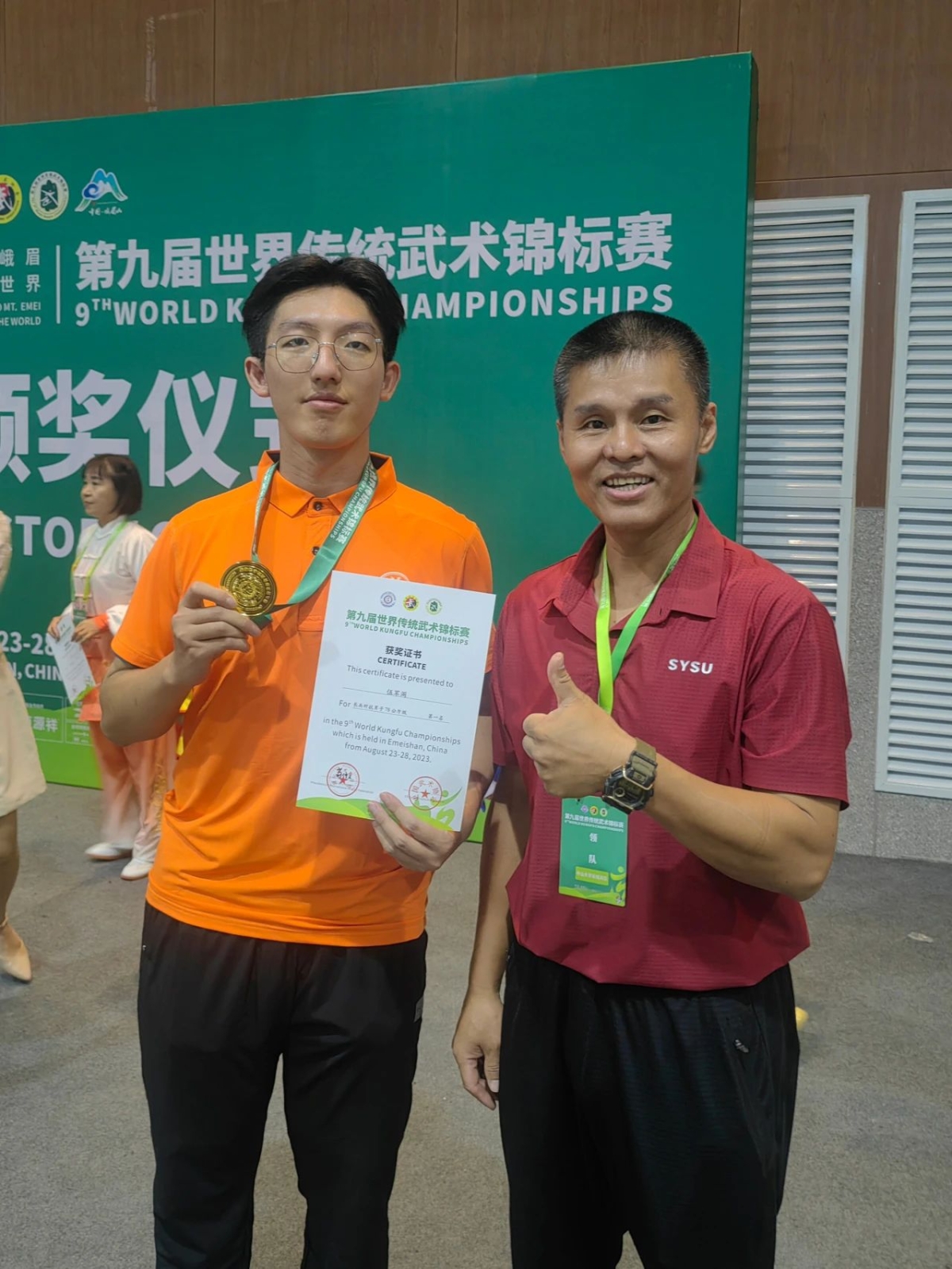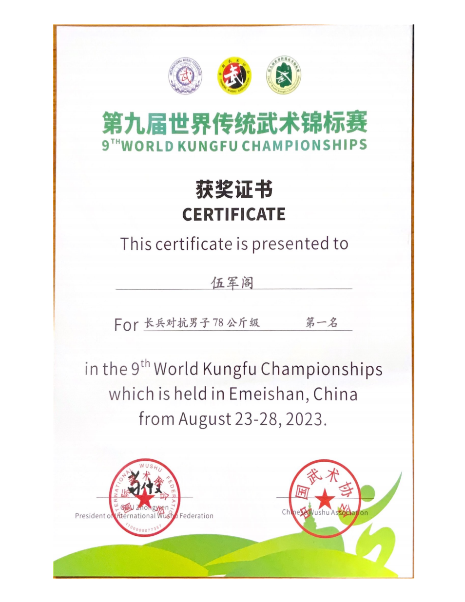 喜讯!402永利集团官网伍军阁同学荣获第九届世界传统武术锦标赛“长兵对抗男子78公斤级”第一名