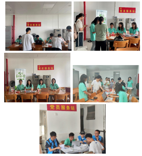 迎新点前,党员志愿者各司其职,登记新生信息,收集入学材料,解答新生关于大学生活、学习的相关问题。