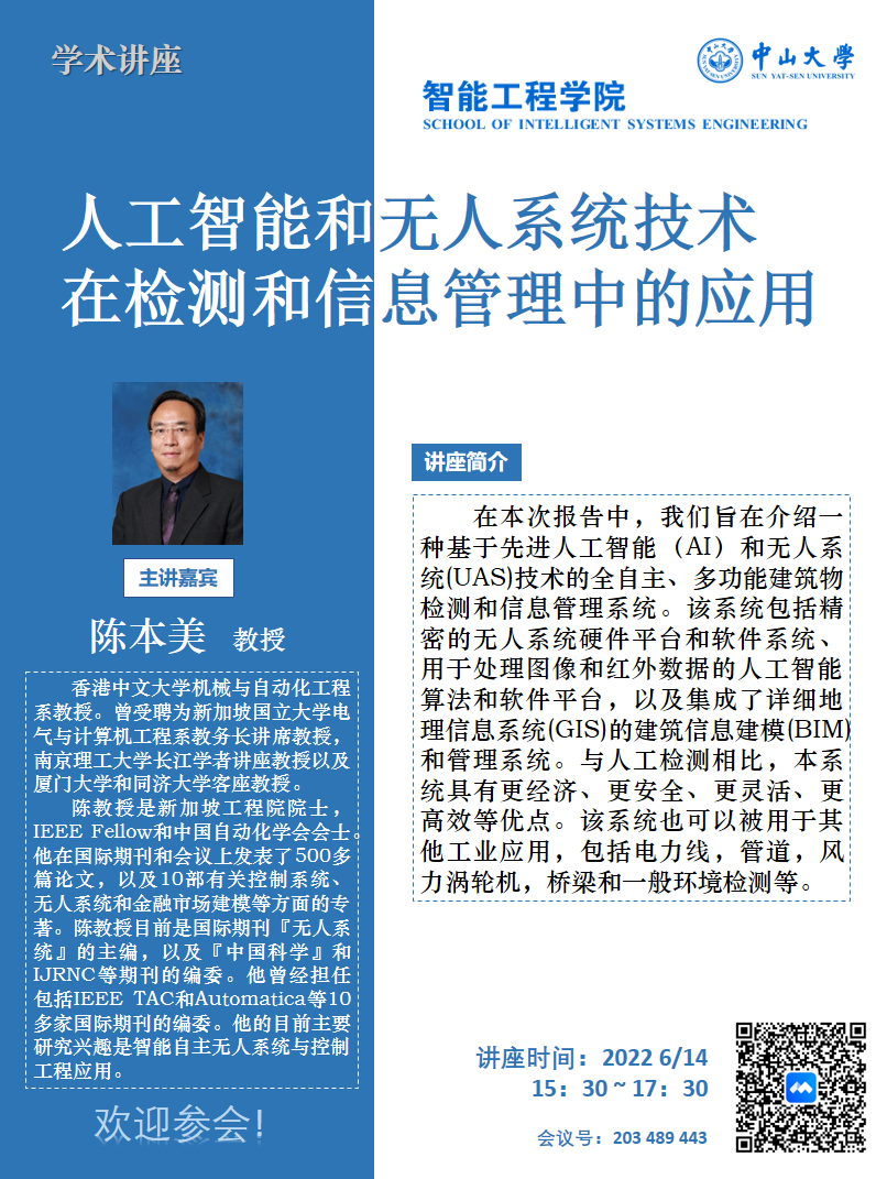 2022年6月14日星期二下午,香港中文大学机械与自动化工程系教授、新加坡工程院院士、IEEE Fellow陈本美应邀为我院师生作题为《人工智能和无人系统技术在检测和信息管理系统中的应用》的学术报告。报告以视频会议的方式举行,由我院李晓东教授主持。