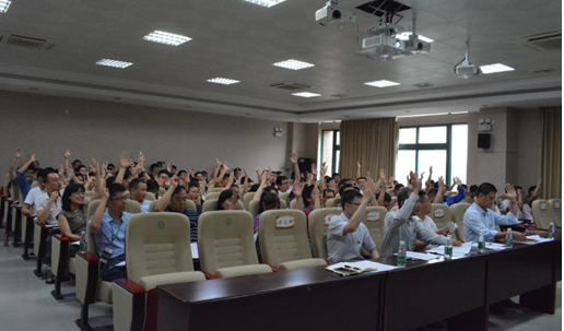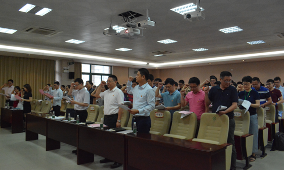 会议最后,由欧阳可全同志领誓,全院党员开展了一次重温入党誓词活动。在鲜红的党旗下,全体党员佩戴党员徽章,举起右手、握紧拳头,庄严宣誓。