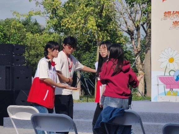 授旗仪式前,我院学生志愿者配合现场光明区义工联工作人员为接下来的授旗仪式、交通安全宣誓仪式中彩排,并协助维持现场舞台秩序。