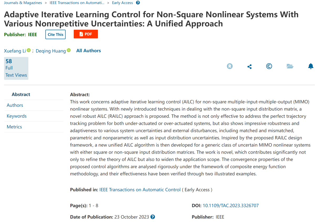 402永利集团官网李雪芳副教授在控制学科国际权威期刊IEEE TAC上连续发表迭代学习控制研究成果