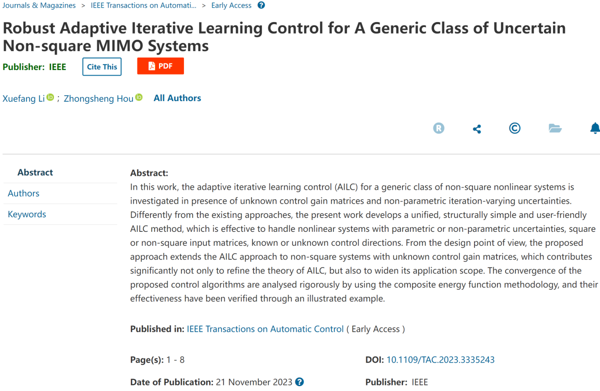近日,在欠驱动非线性系统的自适应迭代学习控制理论研究领域,我院李雪芳副教授取得系列化创新成果,连续以第一作者身份在国际控制领域权威期刊《IEEE Transactions on Automatic Control》发表学术论文2篇,对学院控制科学与工程一级学科的建设与发展具有重要意义。