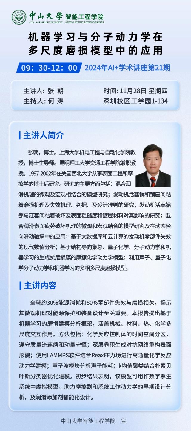 学术讲座 | 张朝:"机器学习与分子动力学在多尺度磨损模型中的应用”的学术报告讲座