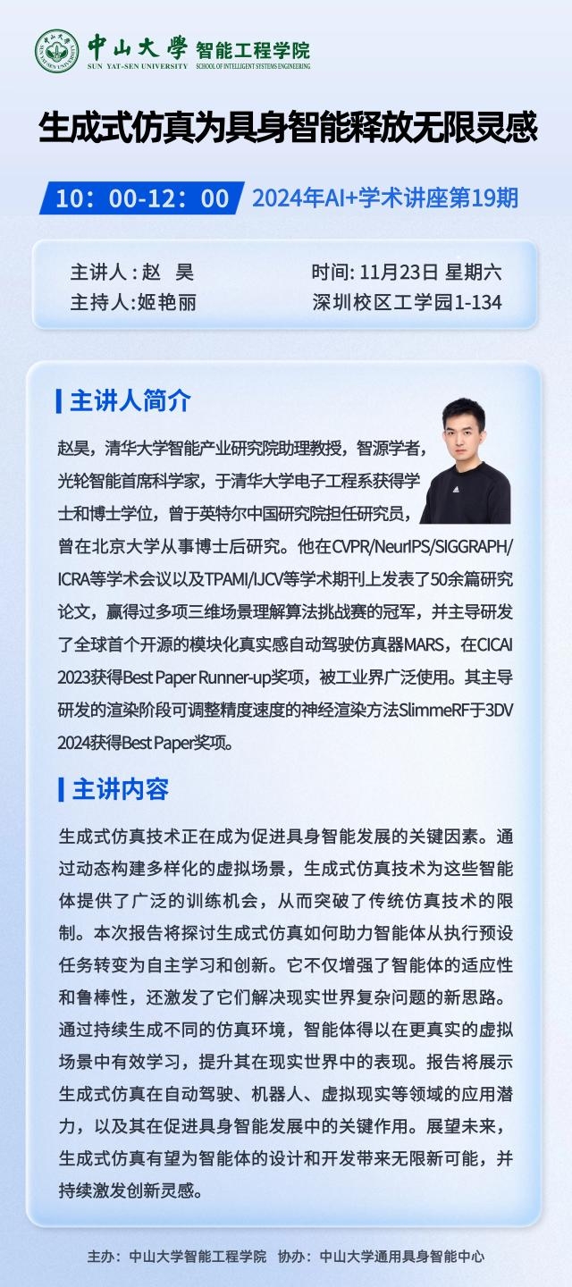 • 学术讲座 | 赵昊:"生成式仿真为具身智能释放无限灵感”的学术报告讲座
