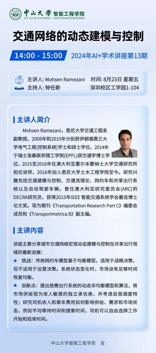 学术讲座 | Mohsen Ramezani:"交通网络的动态建模与控制”的学术报告讲座