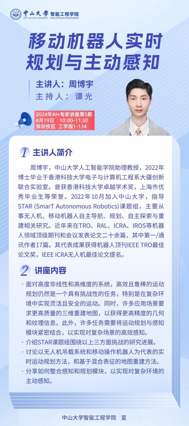 2024年4月19日上午10点,我院举办“移动机器人实时规划与主动感知”主题学术讲座,讲座在深圳校区工学园1栋134举行