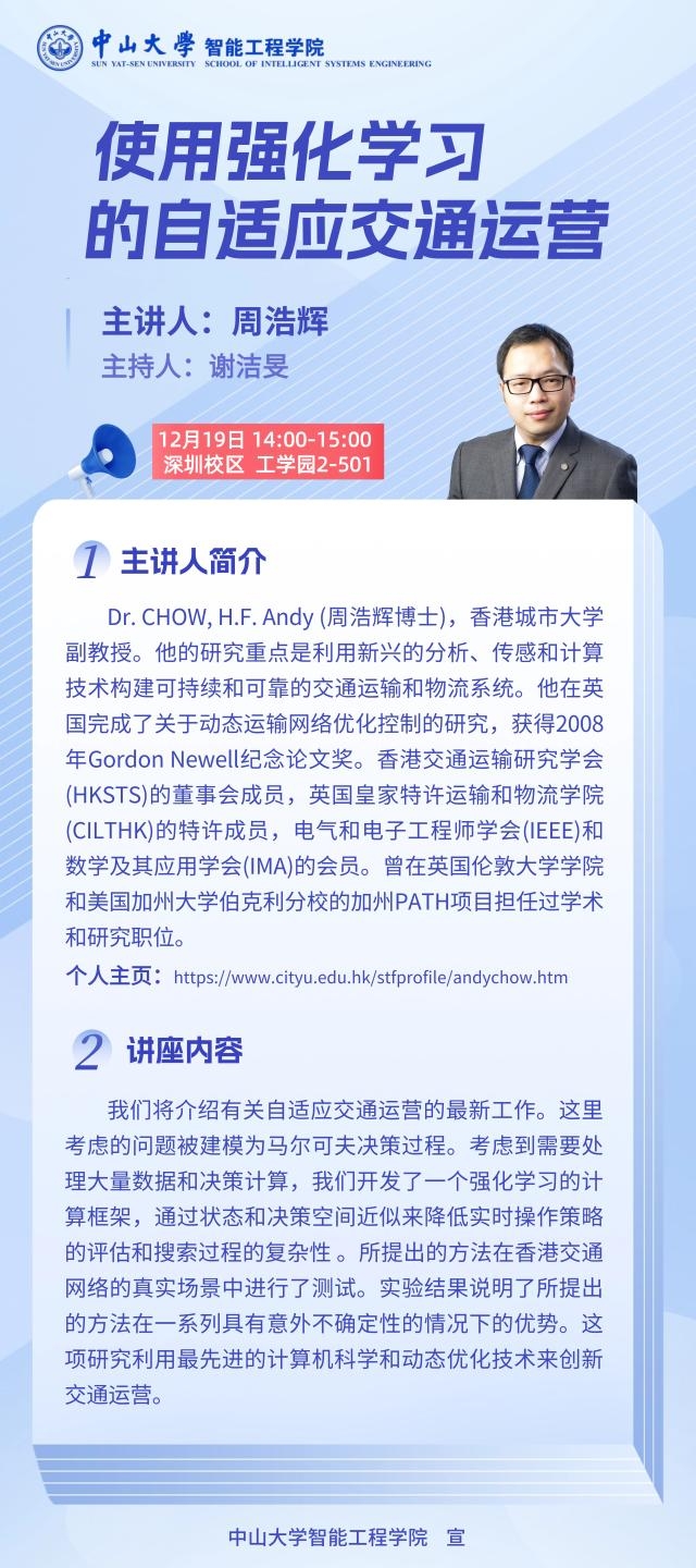 2023年12月19日下午14点,我院举办“使用强化学习的自适应交通运营”主题学术讲座,讲座在深圳校区工学园1栋136举行。
