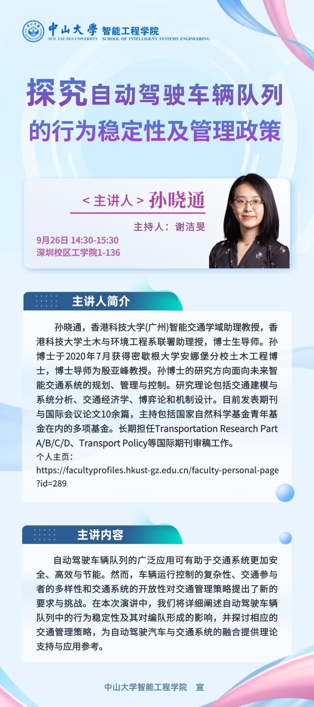 2023年9月26日下午,我院举办了“探究自动驾驶车辆队列的行为稳定性及管理政策”主题学术讲座,讲座在深圳校区工学园1栋136举行。