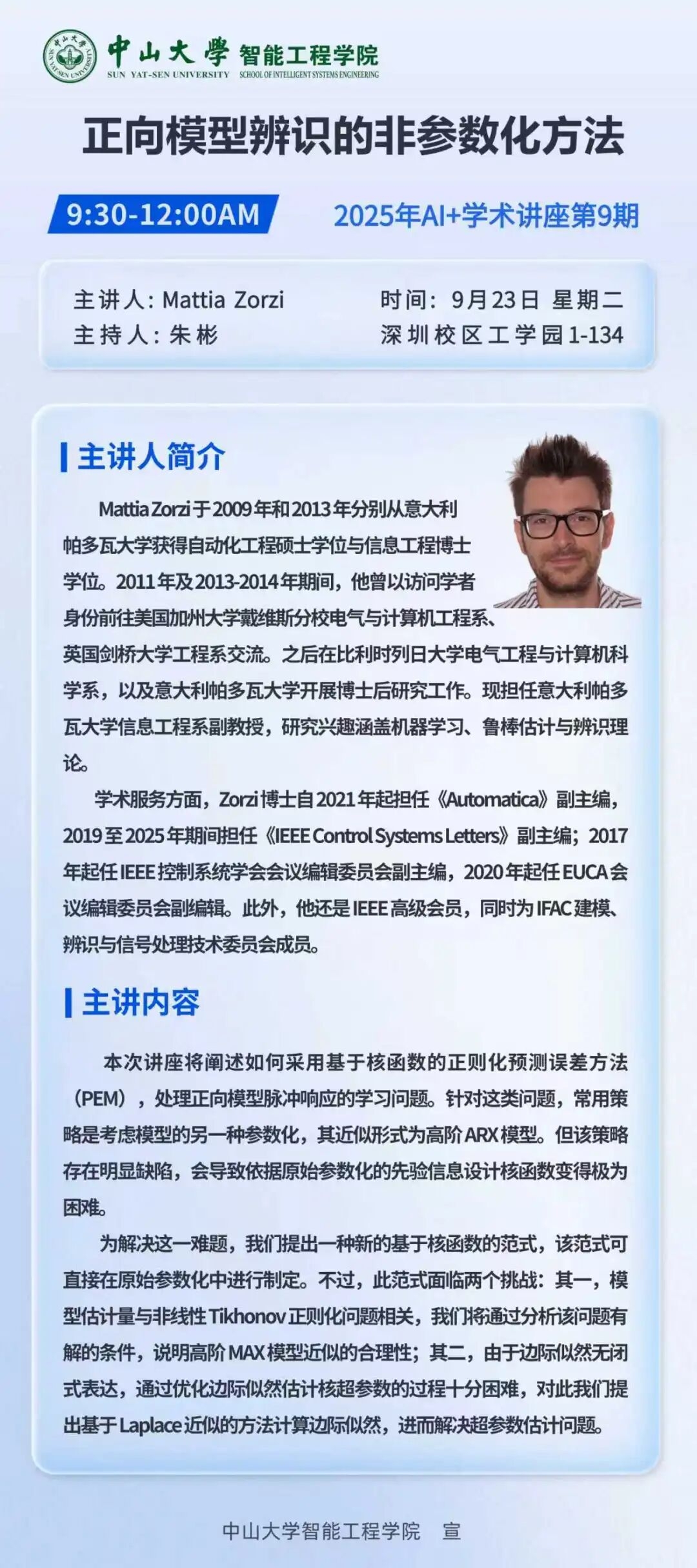 学术讲座 | Mattia Zorzi:"正向模型辨识的非参数化方法”的学术报告讲座