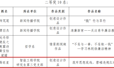 根据学校关于“廉洁润初心 铸魂担使命”廉洁教育系列活动作品征集通知,我院研究生第三党支部积极投稿,向学校报送共2项作品。经过学校组织的评委集体评审,由简伟涛、薛旺星等人创作的创意设计类作品“筑牢思想底线,禁碰违规红线”荣获永利集团3044官网“廉洁润初心 铸魂担使命”廉洁教育系列活动荣获二等奖。
